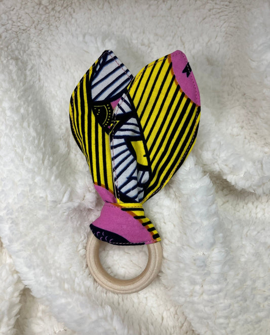 Cotton Bunny Ears Teething Ring | African Print Wooden Teething rings | Yellow/Pink Print